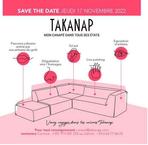 La CCILF s'associe à Takanap pour vous inviter le jeudi 17 novembre 2022 à Takanap Showroom á partir de 17h30 pour un voyage dans leur univers à l’occasion d’une soirée pleine de surprises à vivre tout au long du parcours culinaire animé par leurs artisans du goût.