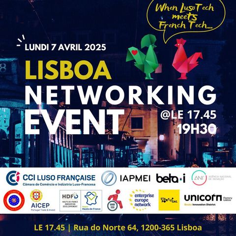 - AVANT le networking, lundi 7 avril de 14h15 à 18h, vous avez la possibilité d'assister aux présentations écosystème : AICEP, CCILF, CLUSTER BATTERY, STARTUP PORTUGAL... suivi d'une visite de la Unicorn Factory (Hub Criativo do Beato) à 16h30. ( Inscription dans le forumulaire)