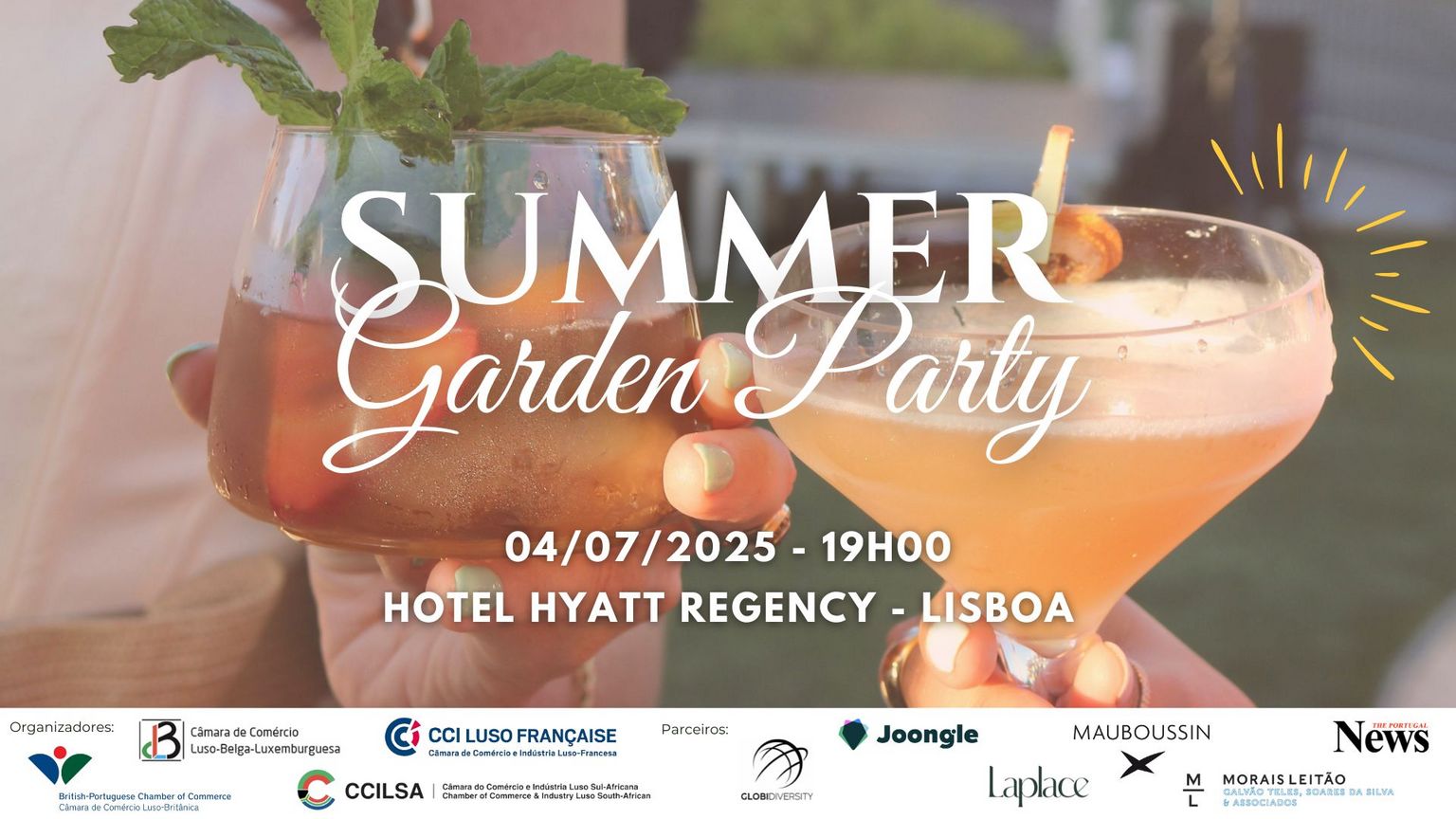 La Chambre de Commerce et d'Industrie Luso-Française, en collaboration avec les Chambres de Commerce Britannique, Belgo-Luxembourgeoise et Sud-Africaine, a le plaisir de vous inviter à participer à la Summer Garden Party à l'hôtel Hyatt Regency. Venez célébrer l'été avec nous !